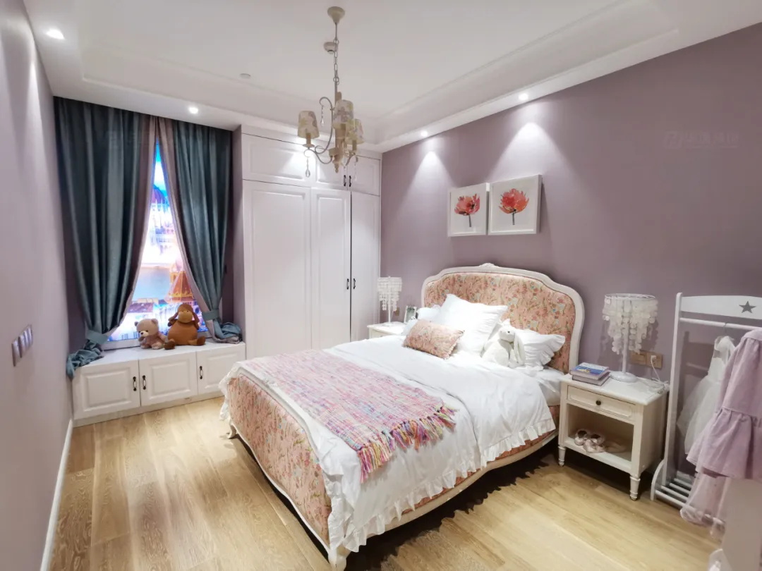女兒房以藕粉色打底,再加上甜美的裝扮,仿若置身于伊甸園,有著公主般的造夢(mèng)空間。