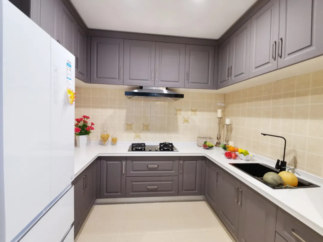 廚房做了U字型設(shè)計(jì),臺(tái)下盆,地柜+吊柜儲(chǔ)物,還有內(nèi)嵌的冰箱,流暢的動(dòng)線,完美的布局。