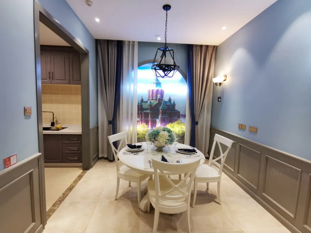 本案美式風(fēng)格,全房以藍(lán)色的壁紙、1米高的咖色護(hù)墻板,奠定清新、涼爽、愜意的空間基調(diào),將都市人對(duì)慢節(jié)奏生活、自由化呼吸的美好憧憬表達(dá)。