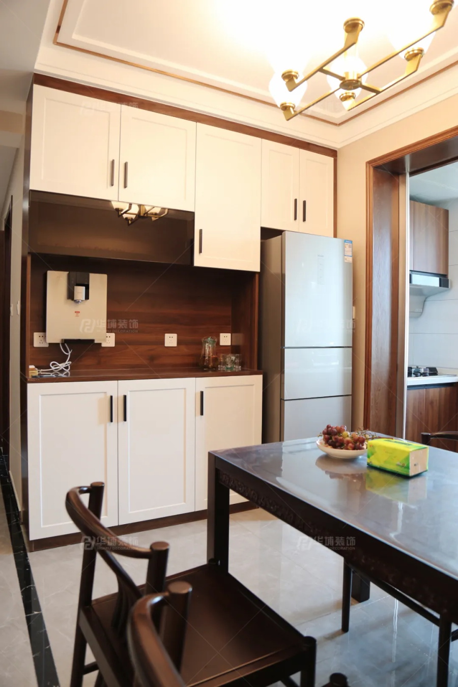 原戶型餐廳比較狹小,為了有充足的的儲物空間,設(shè)計師做了部分改造。首先是對廚房墻體進行拆除,門洞四等分規(guī)劃,兩側(cè)用做開放式收納展示,中間做廚房推拉門,這樣采光好,空間也更加通透。餐廳另一側(cè)墻體設(shè)計成備餐臺,同時兼?zhèn)鋬ξ锱c操作功能,讓擁擠的餐廳可以多元化使用。
