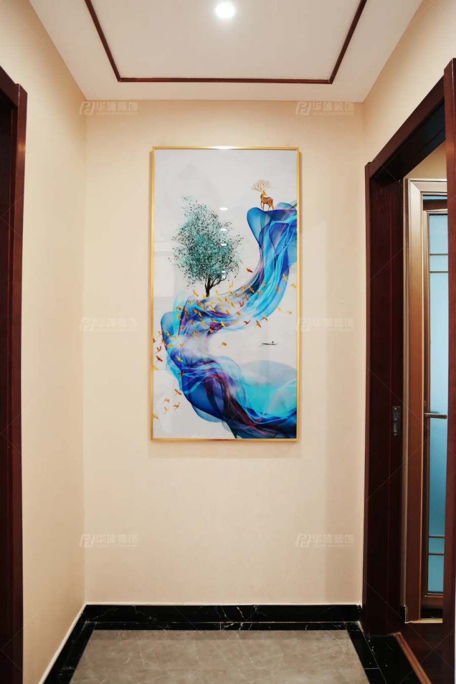 端景,即中式大宅的照壁,有著風(fēng)水上的講究。這幅金鹿高升的端景畫,恰好寓意一路高升,是給業(yè)主夫妻最美好的祝福。