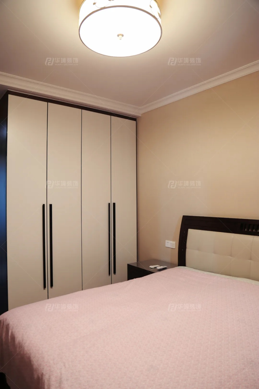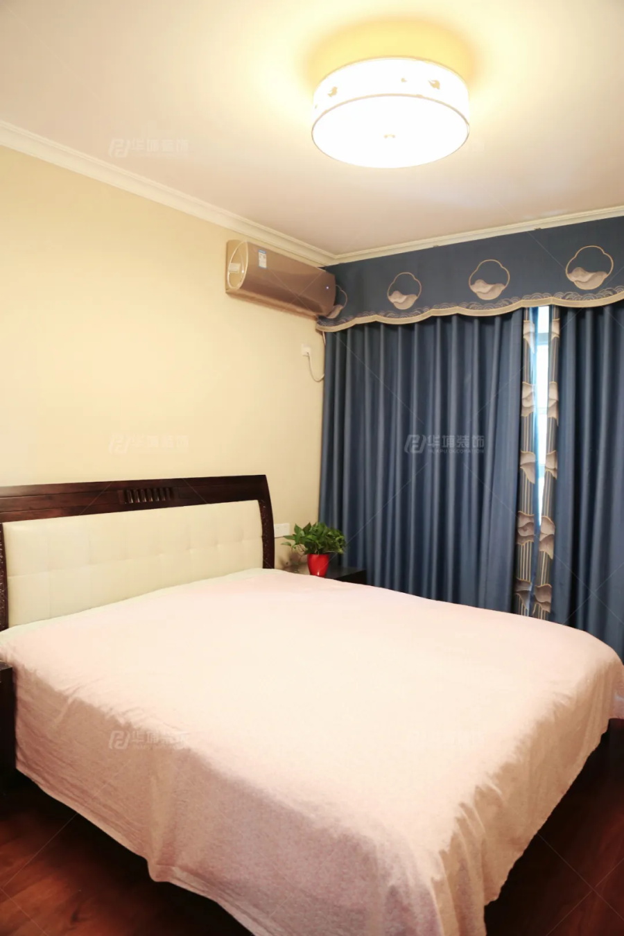 主臥室是夫妻常年居住的,在色彩的選擇上,以淺黃色的墻面為主,主要通過厚重的深色系棉麻窗簾遮光、隔音,來營造一個舒適的睡眠空間。