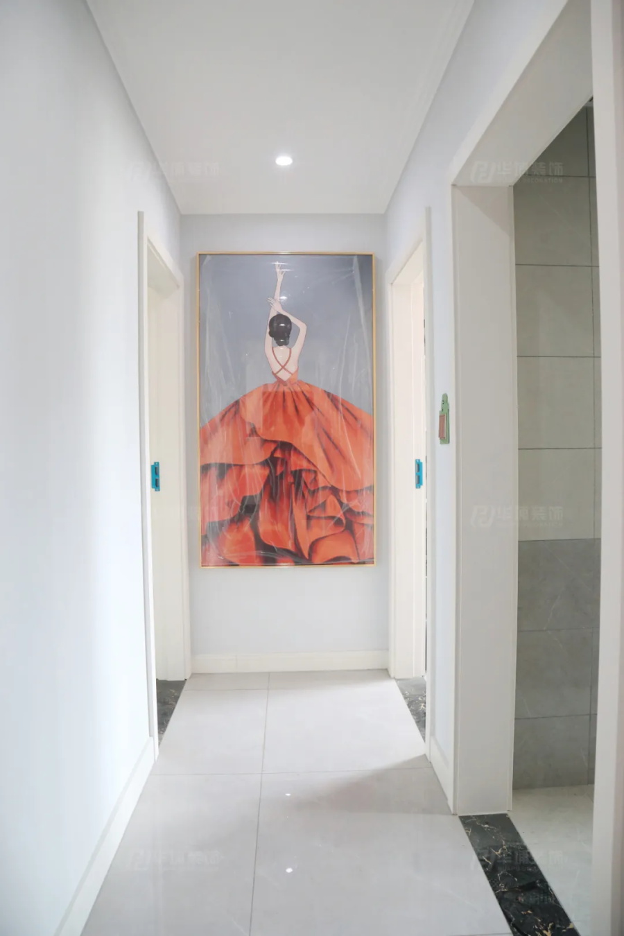 這是一個沒有玄關(guān)的戶型,入戶正對走廊端景,一幅掛畫長裙散開,折纖腰以微步,舞者高貴的美,瞬間奠定整個空間輕如風(fēng)、猶碧玉的品質(zhì)。
