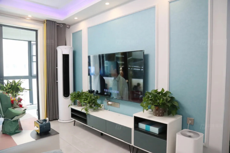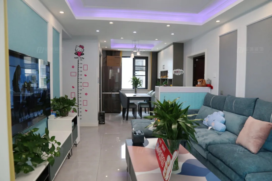 客廳以莫蘭迪配色,灰+藍(lán)+白,沁人心脾的“穿搭”,好清爽!背景墻壁布+石膏線,燈槽吊頂三色閃動,平平無奇的點(diǎn)綴,卻叫人心生歡喜,真的好舒服。