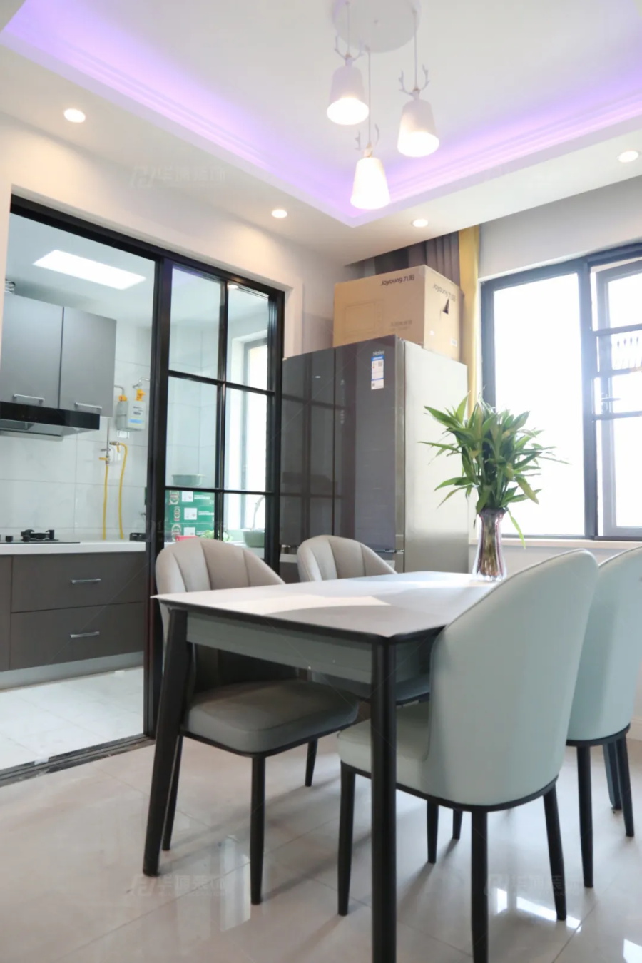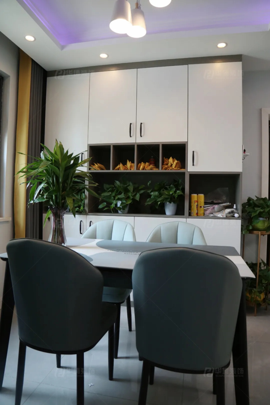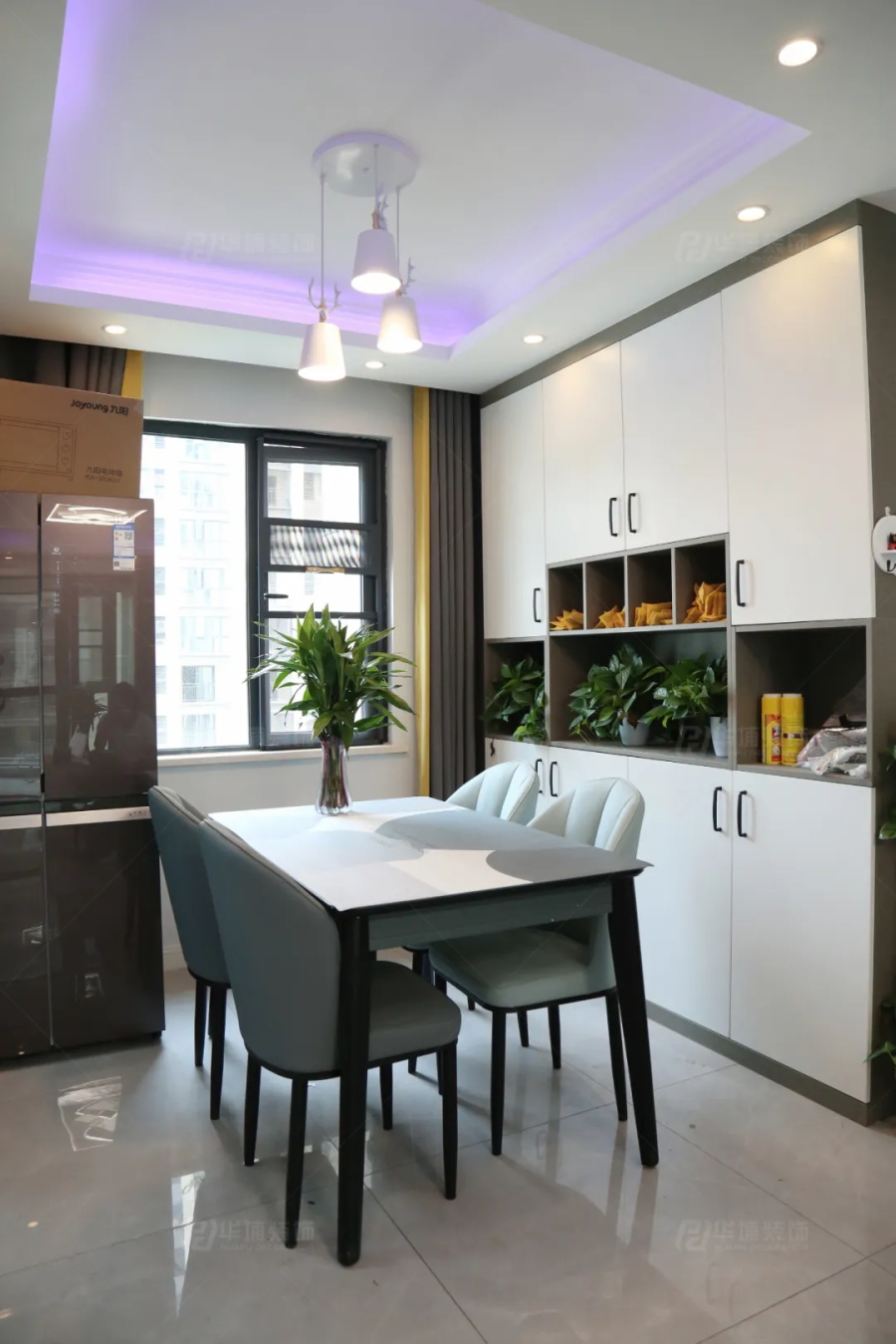 餐廳是青灰色,線條型餐桌椅,現(xiàn)代化質(zhì)感,簡單愉悅的用餐生活。
