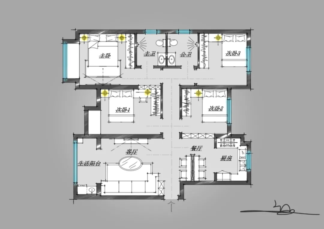 這是一套126平四房,由于原始戶(hù)型存在缺陷,導(dǎo)致采光、通風(fēng)、儲(chǔ)物不足,設(shè)計(jì)師做了局部改造,形成了一個(gè)南北通透、中心對(duì)稱(chēng)的空間布局。