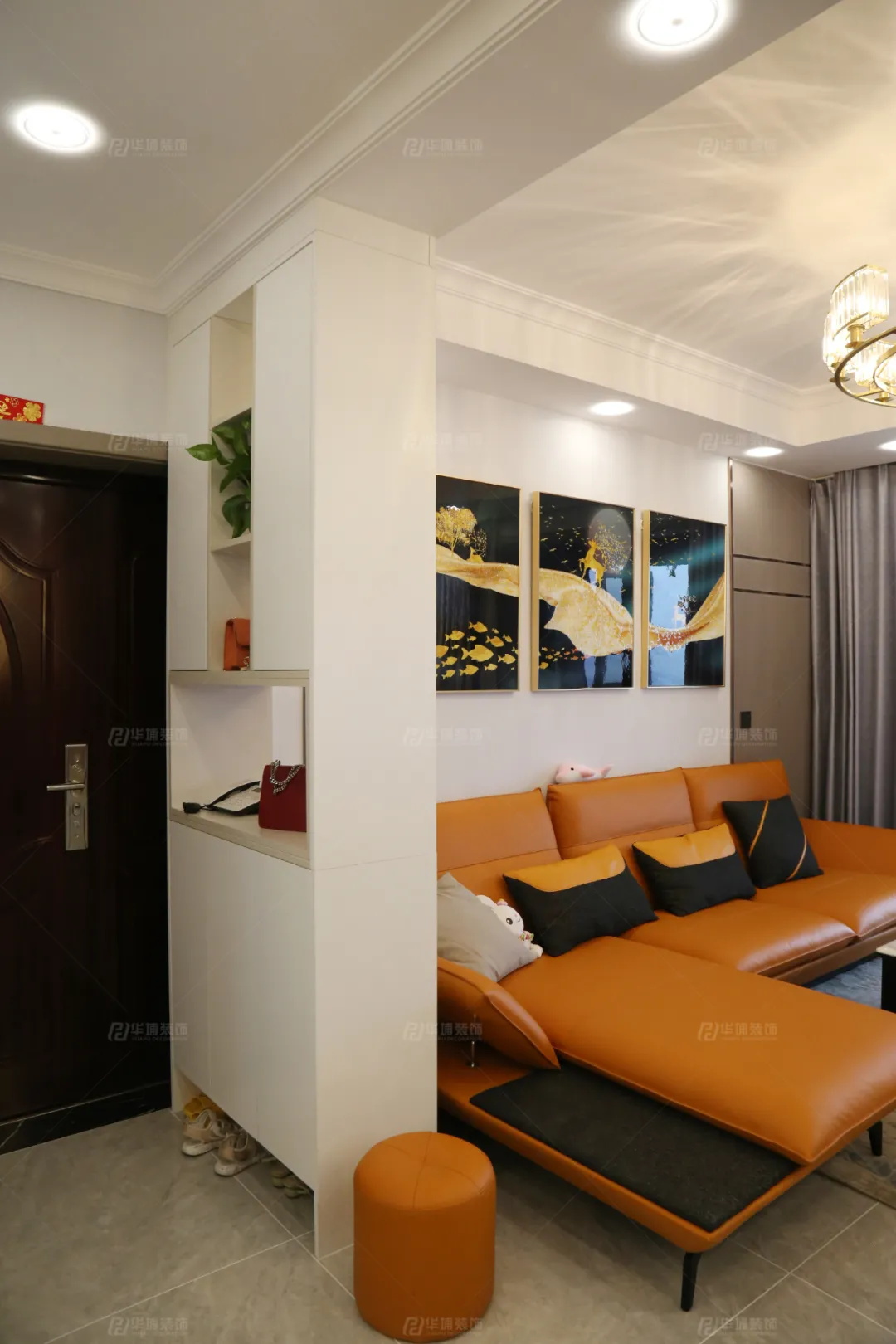 入戶(hù)右側(cè)新建柜子做玄關(guān),增加收納的同時(shí),保護(hù)會(huì)客隱私。為了保持空間整體性,設(shè)計(jì)師在柜子外側(cè)做上石膏板刷飾乳膠漆,增加美觀度。