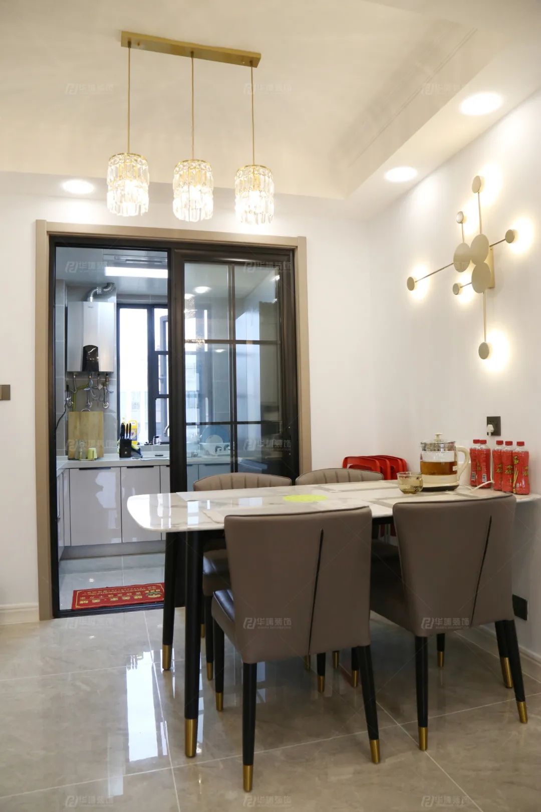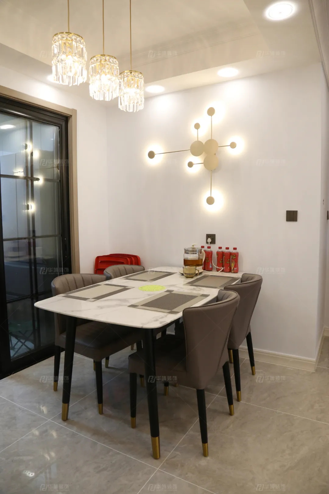 餐廳的光感很強(qiáng),水晶吊燈+幾何壁燈,營(yíng)造了一個(gè)浪漫溫馨的用餐氛圍。除了線(xiàn)條感的餐桌椅,還有整墻的餐邊柜以及展示柜,滿(mǎn)天星+紅酒,與君共天明。