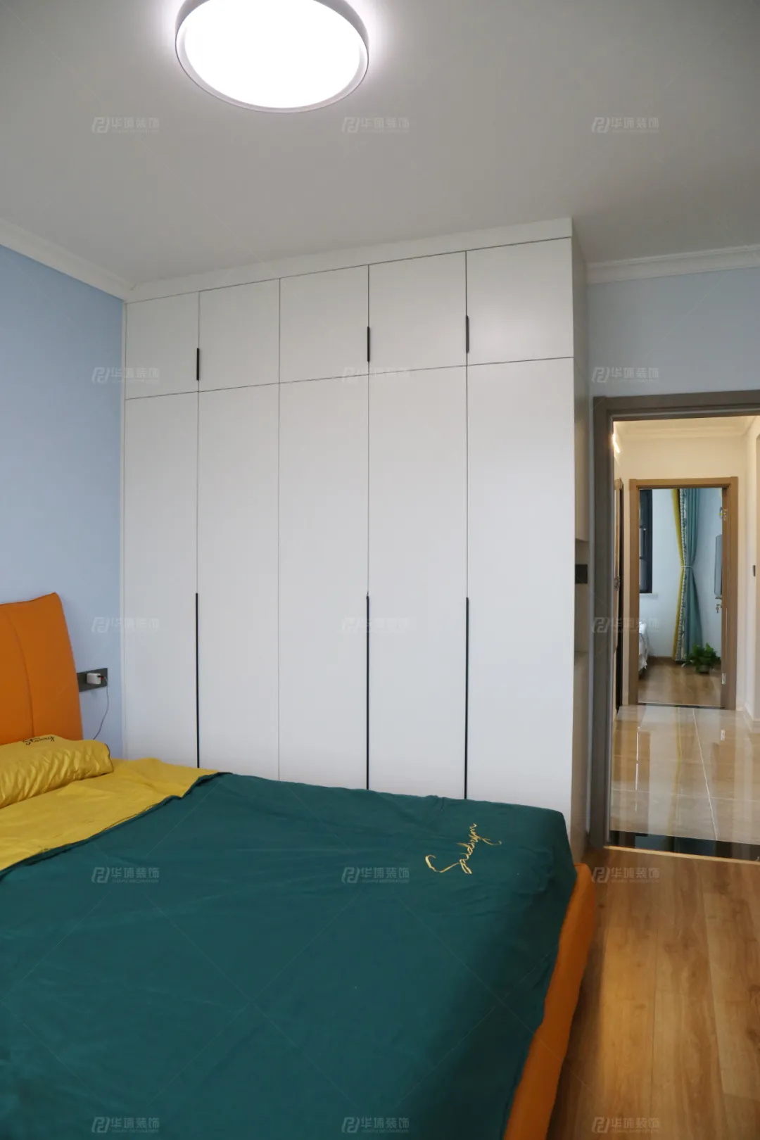 影影綽綽,皆是麗人。主臥的配色很時(shí)尚,恬淡的藍(lán)、飽和的綠、愛(ài)馬仕橙加上米黃灰,豐富的色彩,層次感空間,好溫馨。