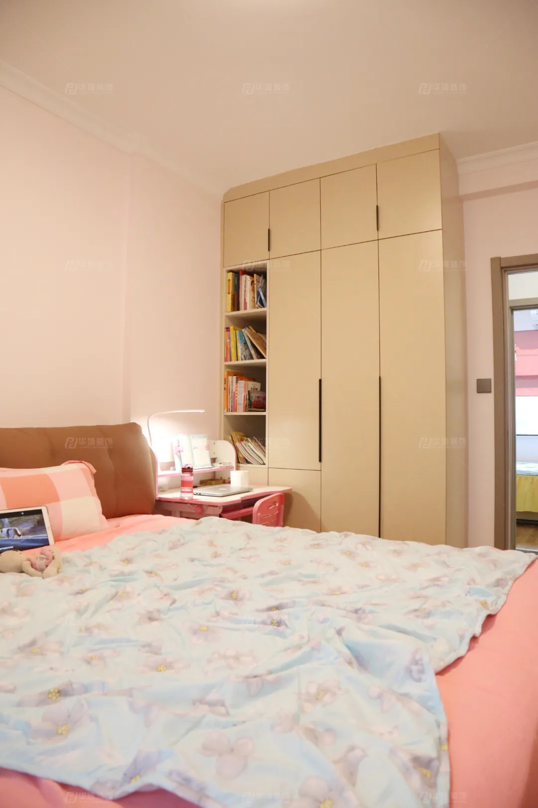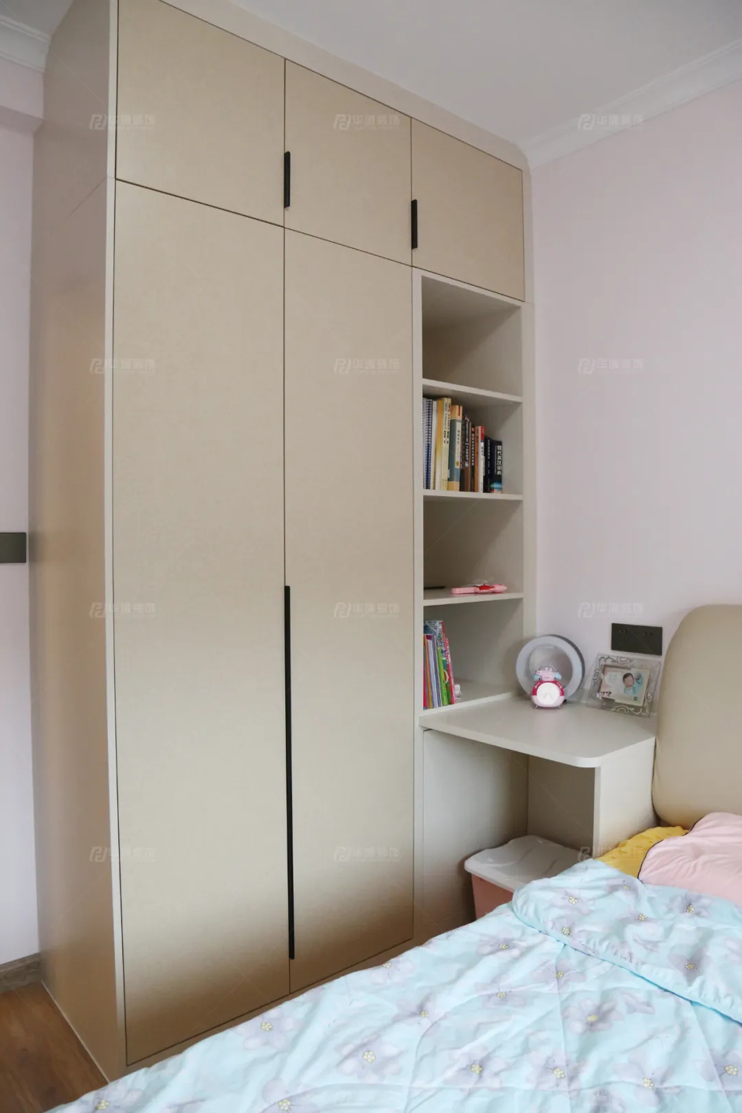 小姑娘的房間融了一抹夢(mèng)幻粉,將童話(huà)定格。衣柜一側(cè)設(shè)計(jì)書(shū)桌,衣柜同時(shí)兼做書(shū)柜,方便小朋友學(xué)習(xí)。