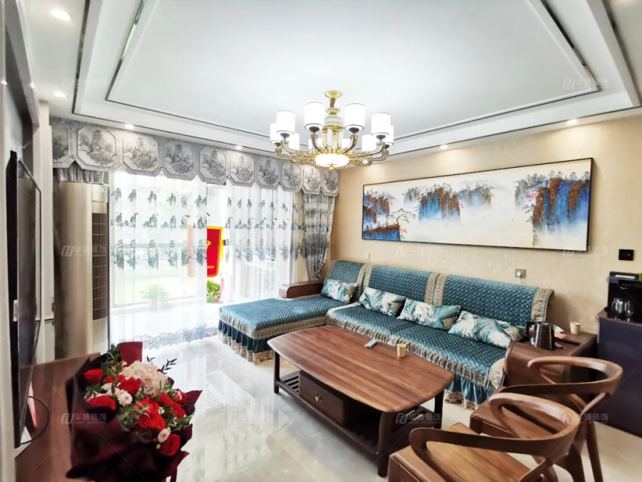 入眼客廳,濃郁的東方元素赫然跳躍。電視墻石材紋路,如溪流娟娟入畫;沙發(fā)背景于壁布之上裝飾一整幅金山,富貴彰顯。再看窗簾,水墨渲染,扣動絲絲心弦。