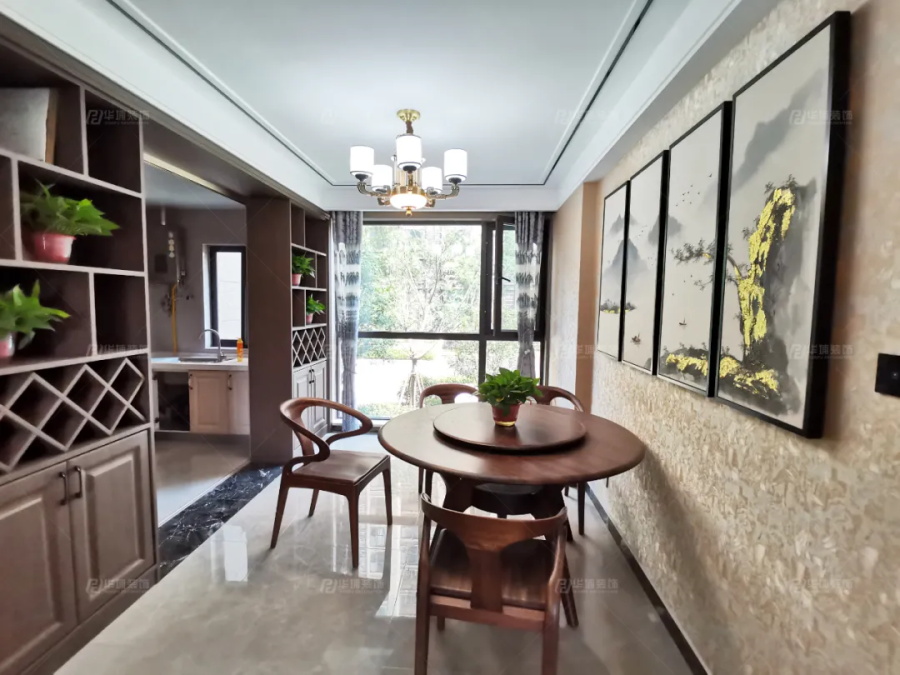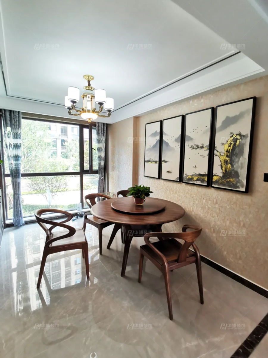 餐廳選用傳統(tǒng)的中式圓桌,是團聚和幸福的祈愿。酒柜、餐邊柜以廚房為中心軸,內(nèi)嵌在兩側(cè),可以藏酒,可做收納。背景墻掛了一組中式山川畫,細品皆是詩情畫意。