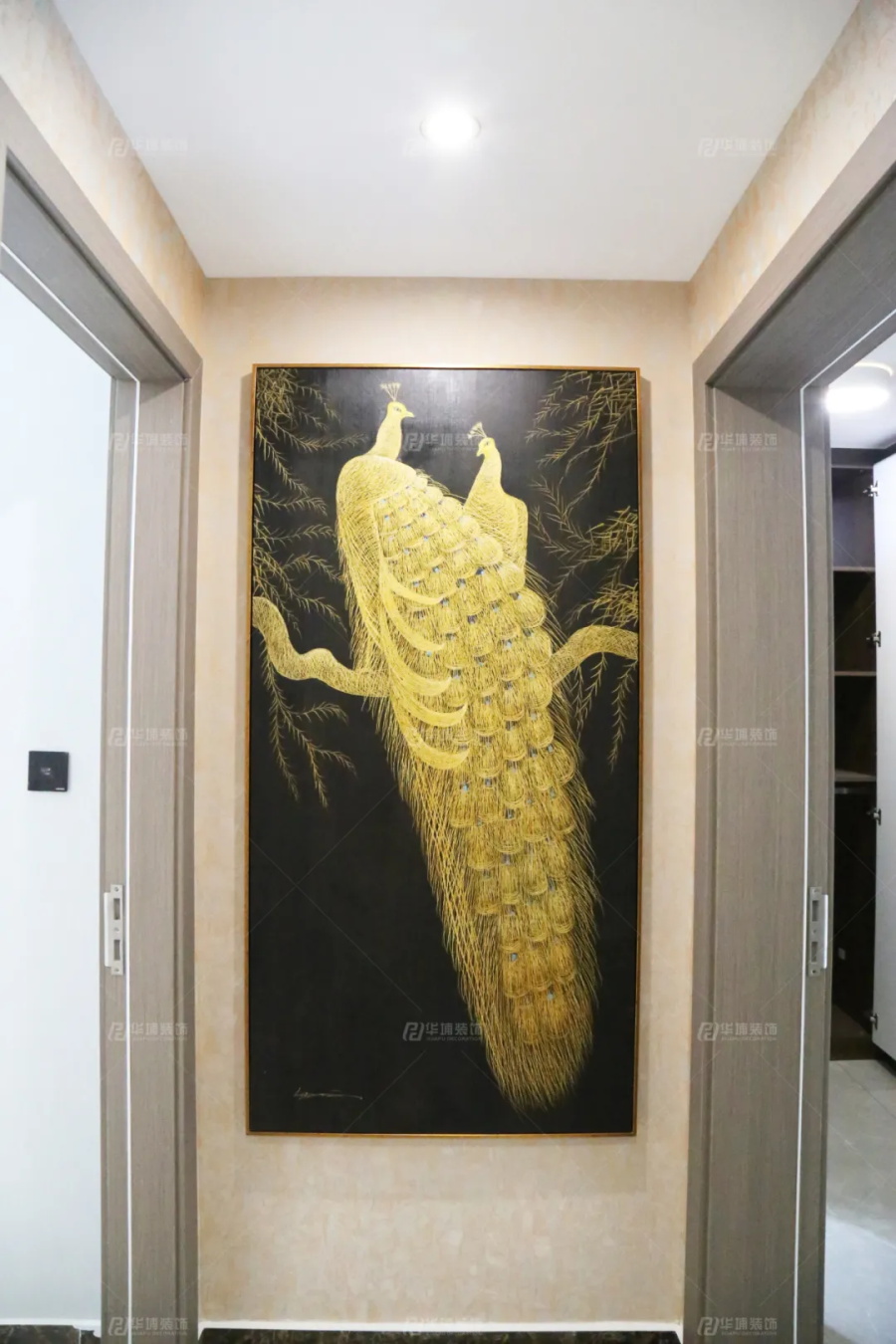 走廊端景一幅《鳳凰雙棲》,將愛情最美的樣子刻畫。那金燦燦的羽翼,又是金錢和財富的象征,寄予著設(shè)計師對業(yè)主的雙重祝福。