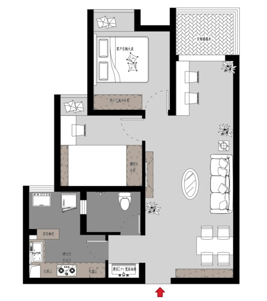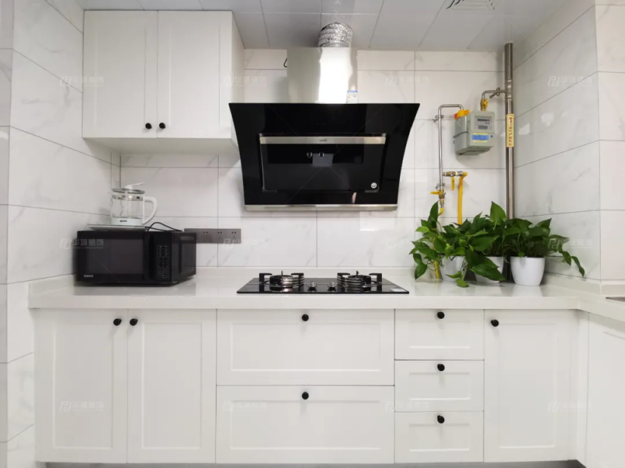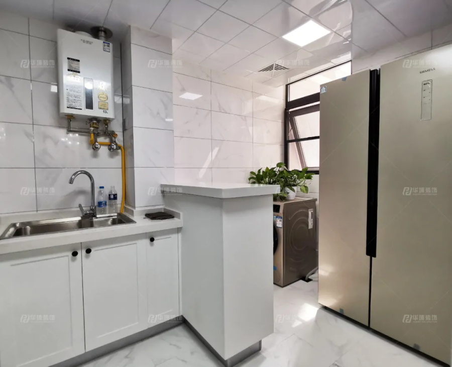 (2)廚房做了中島吧臺(tái),將內(nèi)部陽臺(tái)作為洗衣陽臺(tái)使用。