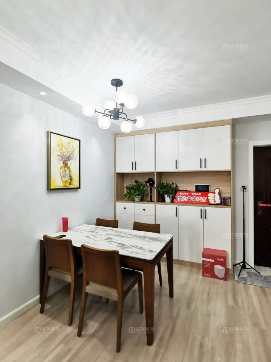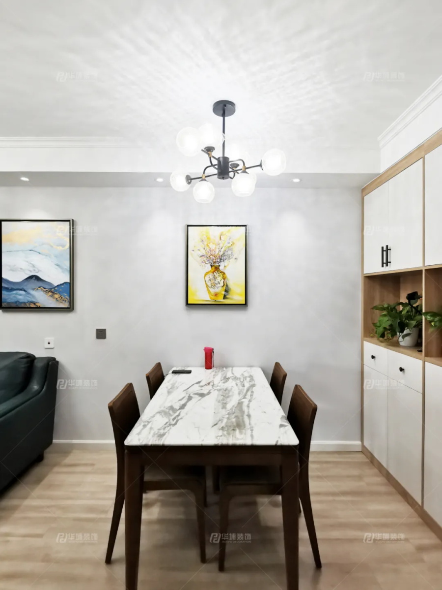 客餐廳沒有明顯的功能分區(qū),統(tǒng)一的吊頂,將空間的整體性突顯。餐廳的陳設(shè)非常簡(jiǎn)素,墻上的花瓶是一抹亮色跳躍,暖了整個(gè)餐廳。