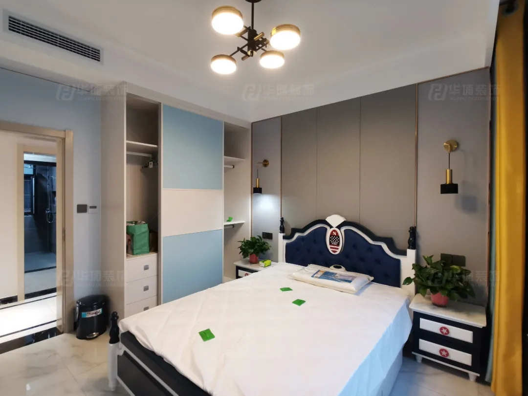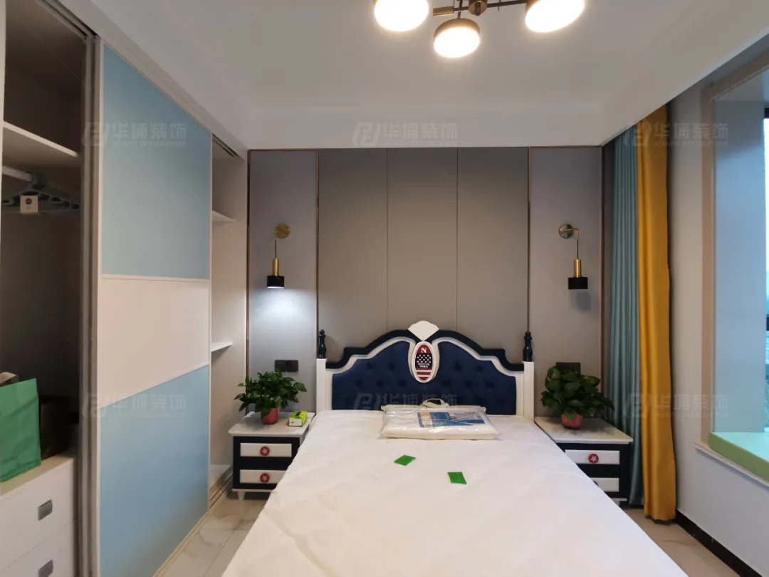 藍(lán)色是冷靜的代表色,與莫蘭迪灰的調(diào)和,是想營(yíng)造一個(gè)平靜、舒緩的睡眠空間。窗簾加入黃色點(diǎn)綴,是要給寶寶更加溫暖、更有安全感的氣息。