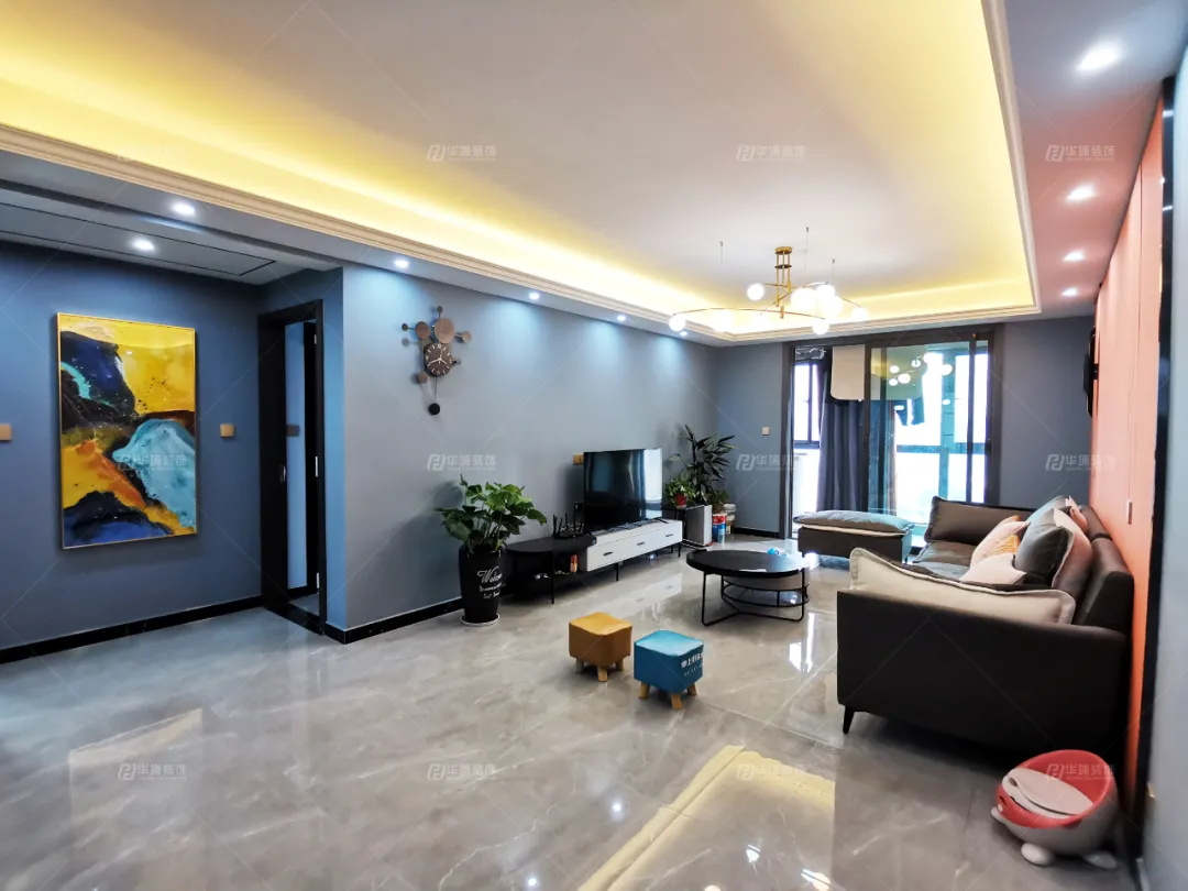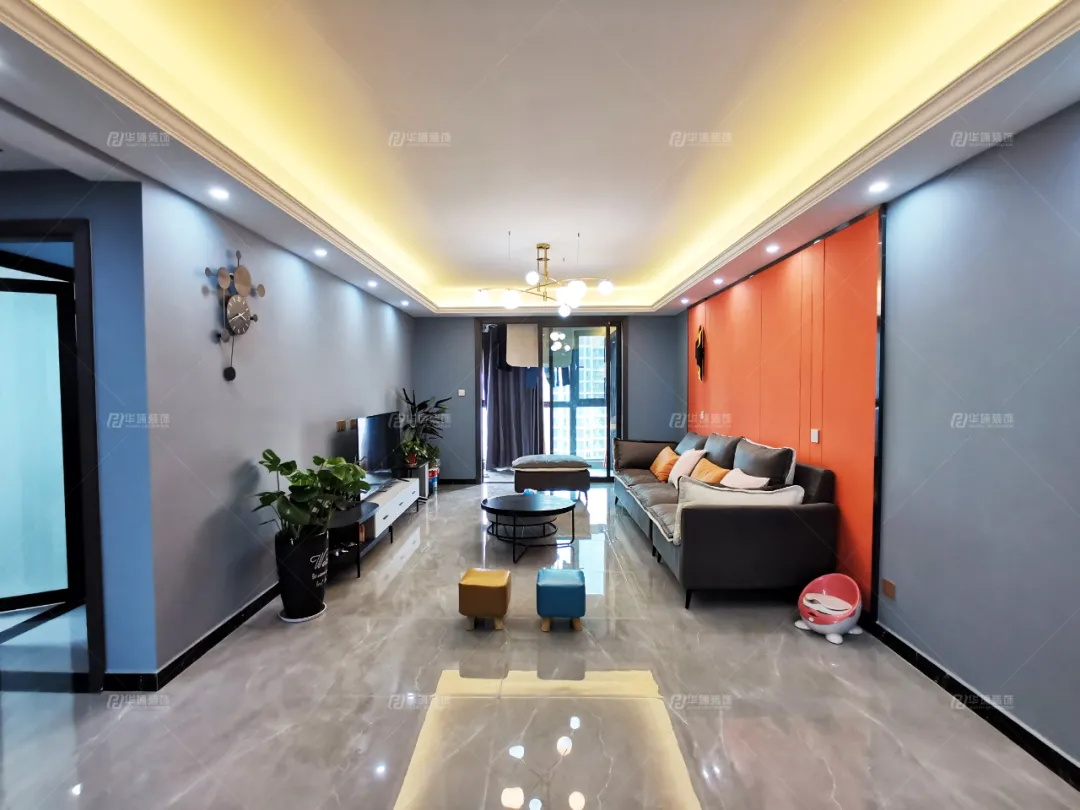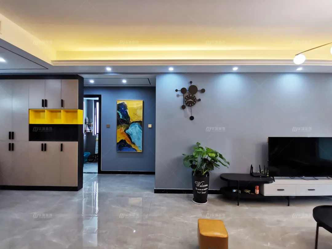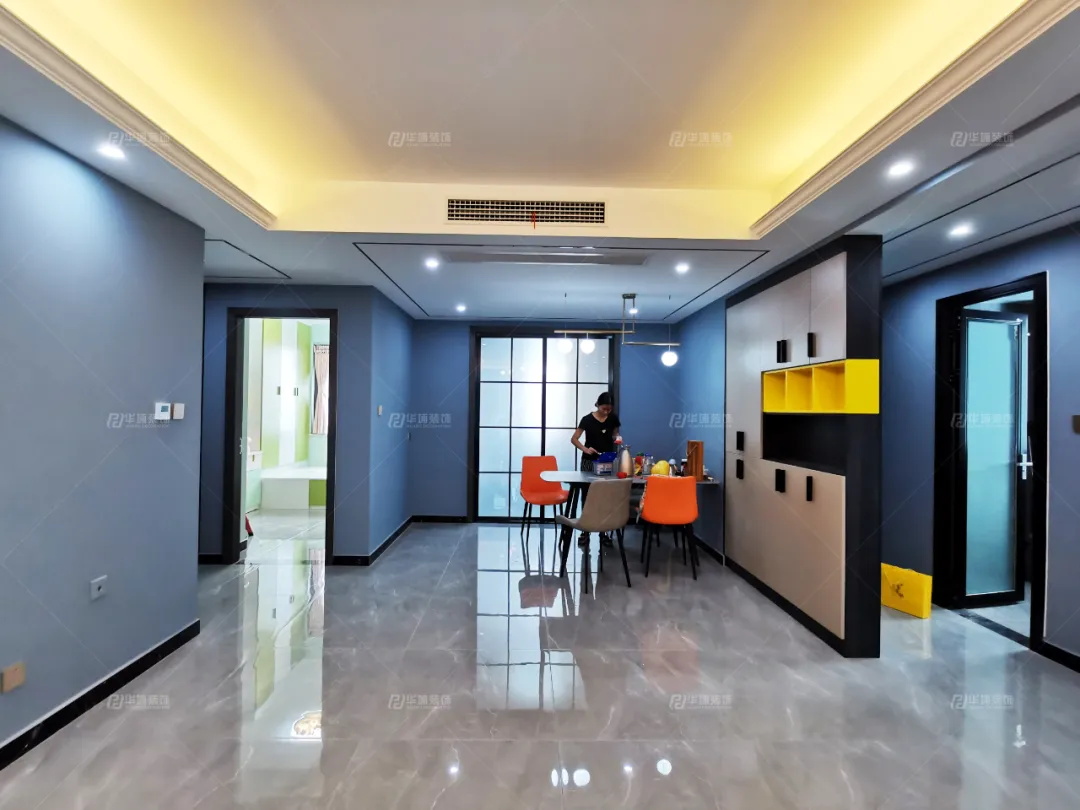 整個空間的墻面是以藍(lán)色貫穿到底的,通過沙發(fā)背景的愛馬仕橙完成跳躍,冷暖相生相克,讓色彩的魅力以及生活的緊迫感得到了徹底釋放。