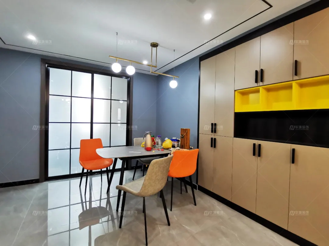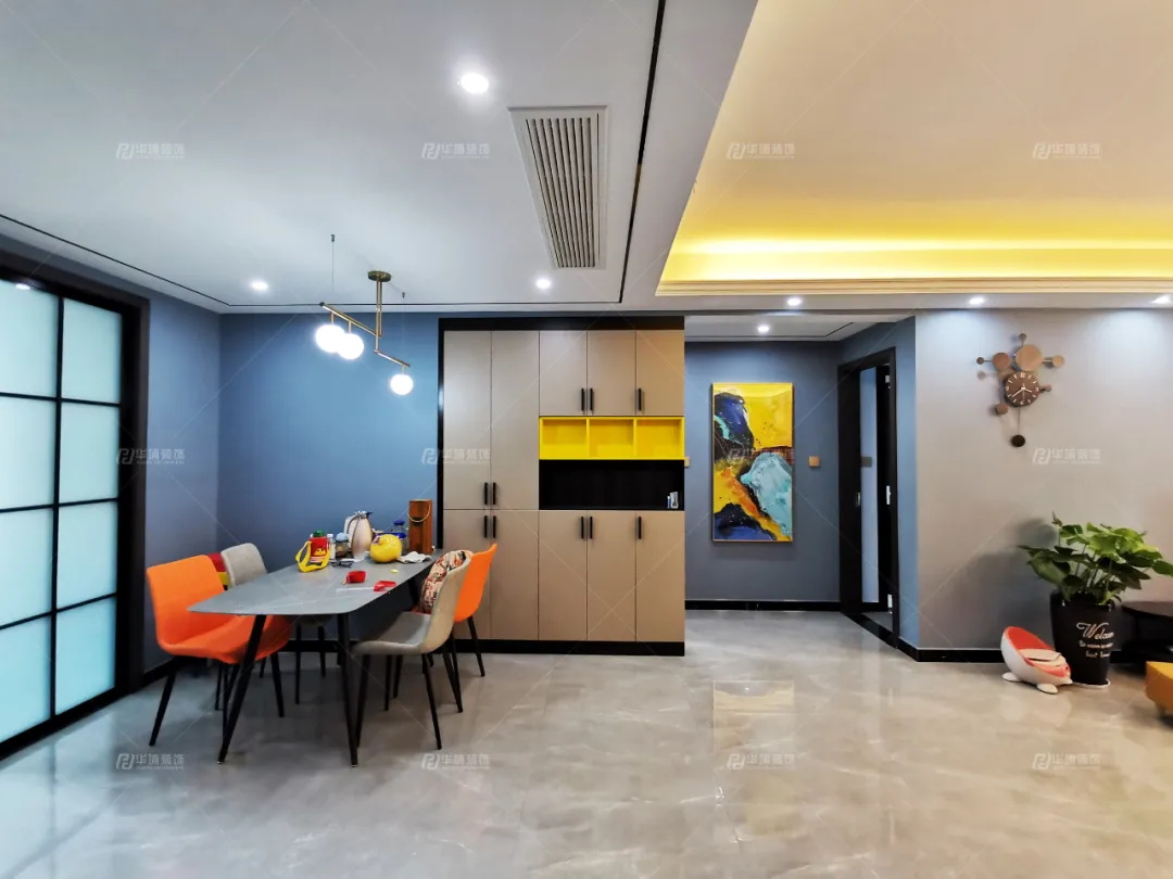 客餐廳是一個大合體,一組內(nèi)嵌的餐邊柜來破解入戶正對衛(wèi)生間的尷尬,同時解決餐廳的儲物需求。簡化的功能陳設(shè),跳動的色彩,來實現(xiàn)業(yè)主對待生活的那份認(rèn)真和美妙構(gòu)想。