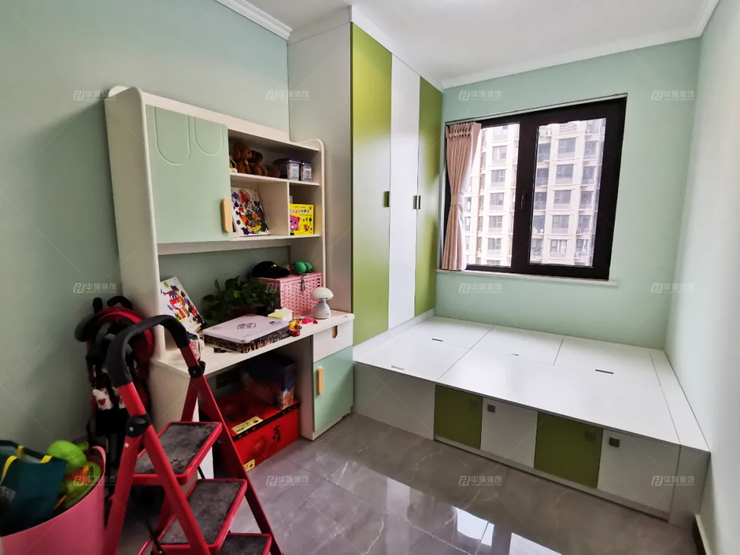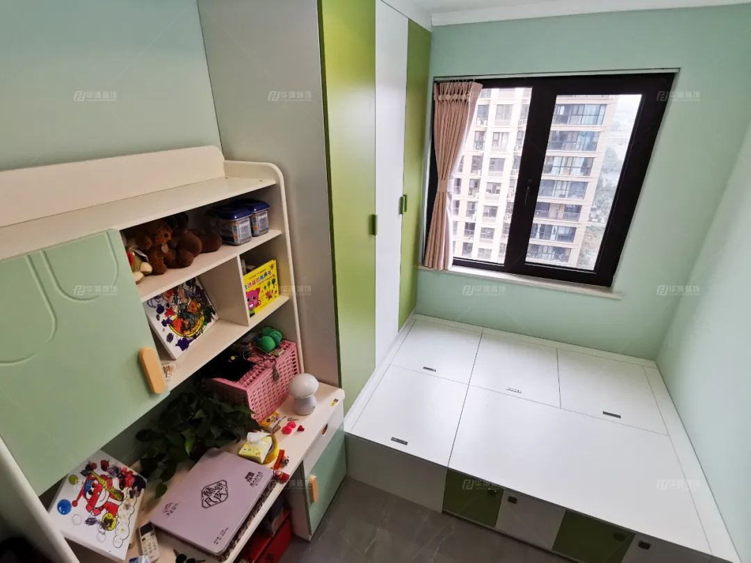 兒童房設(shè)計了榻榻米連柜書桌,不同色階的綠與白色的穿插融合,讓簡單的空間富于生機,更加隨性。