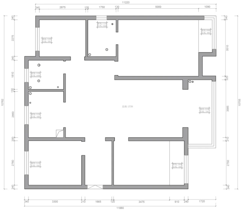 (2)原餐廳正對東側(cè)兒童房,現(xiàn)在餐廳后方新建墻體做雙面酒柜和衛(wèi)生間干區(qū)。