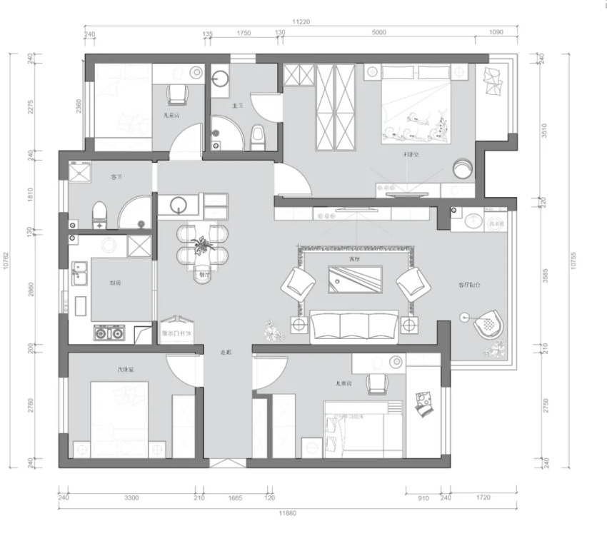 (1)入戶右側(cè)兒童房原門體朝向在客廳,現(xiàn)改到北側(cè),與老人房對向,加強空氣對流;