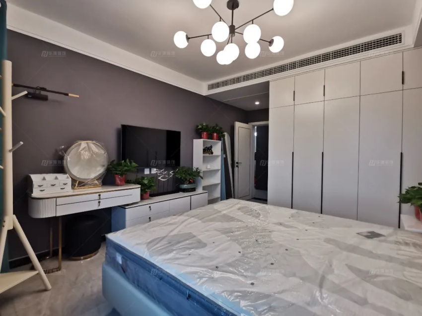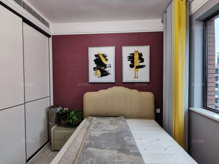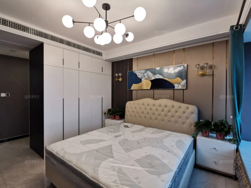主臥內(nèi)容豐滿,硬包+護墻板+不銹鋼金屬線條+掛畫,多元素組合的背景墻,沒有絲毫的突兀,反倒是更加立體。衣柜是做了雙面柜體設計,外側(cè)做小衣帽間,內(nèi)側(cè)整理日常,實用滿分。