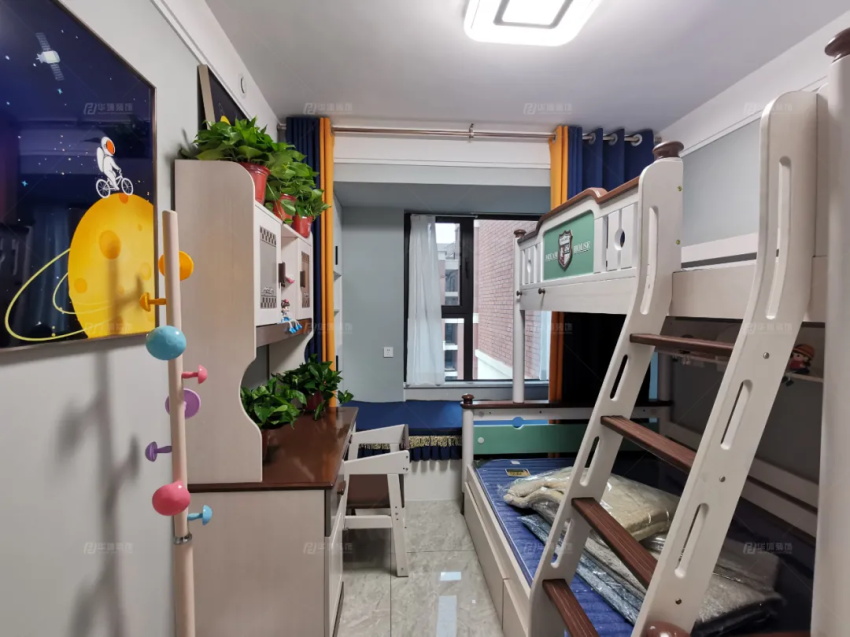 入戶兒童房做了上下鋪,藍色與黃色提亮空間,是夢幻的裝扮。內(nèi)側(cè)飄窗可儲物可讀書,可休閑可玩耍,留給童年一個肆意揮灑的空間。