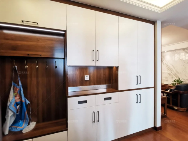 玄關(guān)映入眼簾的是一個(gè)組合柜,有非常強(qiáng)大的儲(chǔ)藏功能。柜體陳設(shè)是根據(jù)入戶換鞋、掛衣、放鑰匙包包的行為動(dòng)線排列的,同時(shí)還加入了大容量?jī)?chǔ)存過(guò)季衣物的分柜,妥妥的一個(gè)衣帽間呈現(xiàn)。