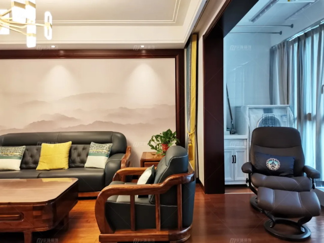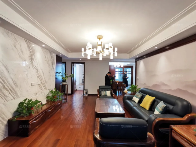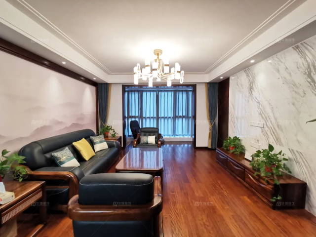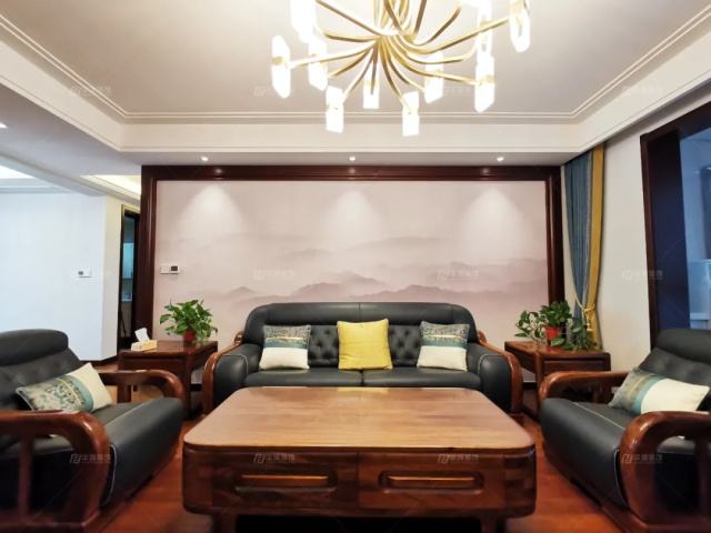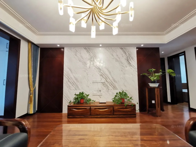 客廳做了一個(gè)色彩的對(duì)比,通鋪的實(shí)木地板奠定了暖、古色的基調(diào),沙發(fā)背景是層巒疊起的山川,電視墻水墨樣花紋大理石,山水有相逢,來(lái)日皆可期!