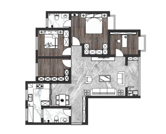這個戶型和我們048期推廣的實景工地很相似,是做了一個戶型鏡像,設計師也是根據(jù)客戶需求,對原始戶型做了一定的改動,以增加儲物空間: