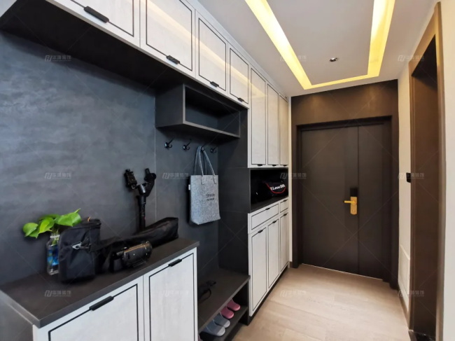 玄關緊鄰餐廳,做了一個內(nèi)部延伸,補充吧臺的功能。玄關柜是灰白配色,線條做框邊造型,來增加立體感。整個入戶是滿足了換鞋、掛衣、儲物的多項功能,是一個便捷生活的“小工具”。