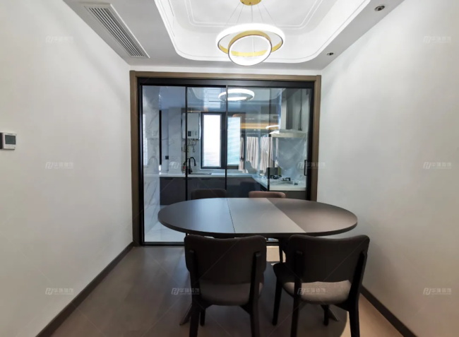 餐廳是可伸縮性的圓形餐桌,與透明推拉門的廚房做了一個呼應,讓空間不那么單調(diào)。