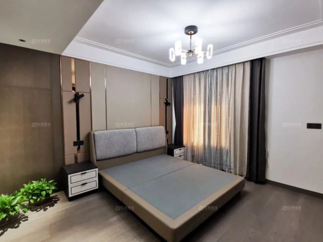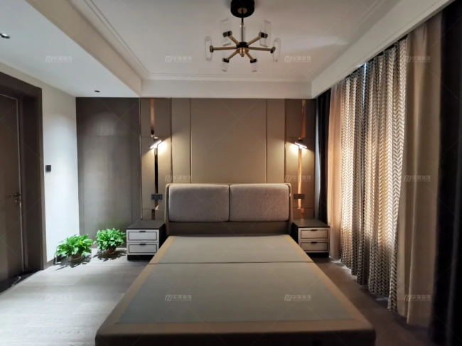 主臥是一個小套間,融入了質(zhì)感溫潤的木色系,硬包造型,金屬線條,木飾面板,輔以墻面射燈的暖光源,讓整個居室簡潔、舒適又實用。