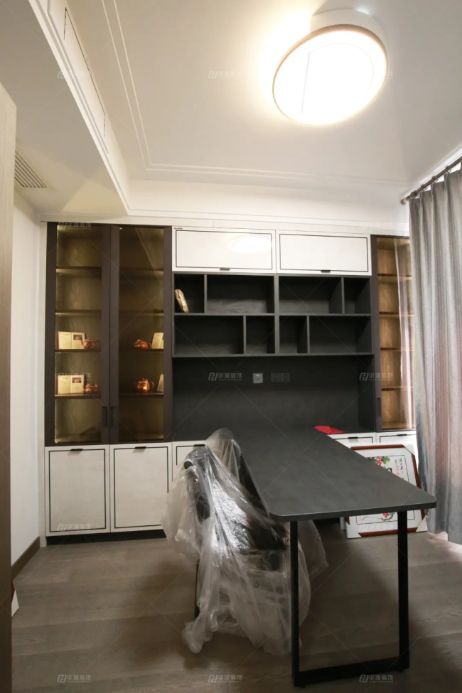 電視墻隱形門后的書房,做了一整面墻的書柜,有很多小方格設計,可以分類整理書籍,也可以擺放一些小物件做裝飾,豐富一下空間。