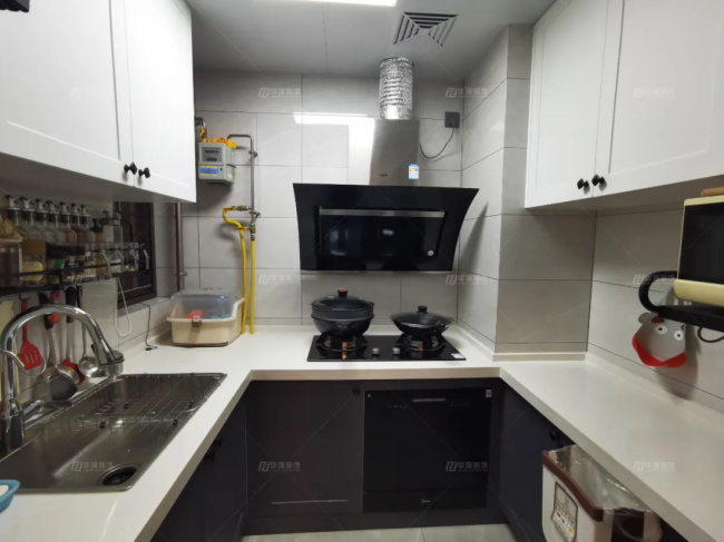 廚房是內(nèi)推拉隱形門,做了U字型設(shè)計(jì),洗切炒+電器區(qū),吊柜+地柜+儲(chǔ)物,把這個(gè)小空間做到了極致利用。
