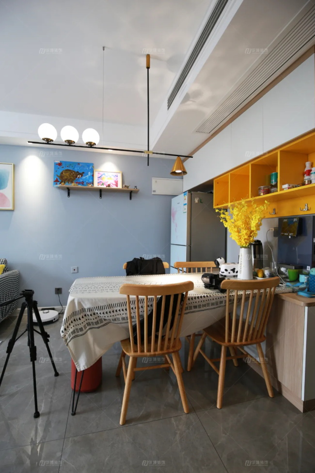 設(shè)計(jì)師把冰箱的位置留在了餐廳,同時(shí)預(yù)留了水吧臺(tái)、收納格,做一個(gè)簡單的置物。讓我們把目光聚焦到餐廳背景,純凈的藍(lán)色墻面上置放小朋友的手工畫,讓整個(gè)空間多了一分家的溫暖與甜蜜。