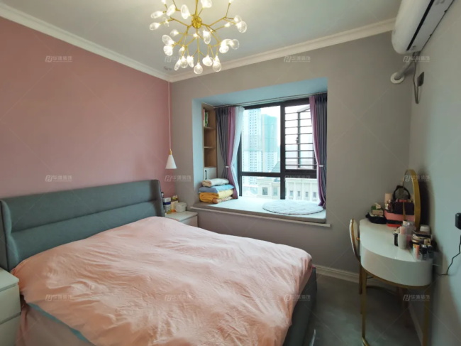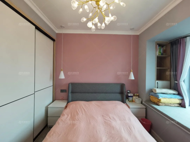 主臥以公主粉、莫蘭迪灰著色,梳妝臺(tái)整理妝容,飄窗休閑凝思,又溫柔又愜意。