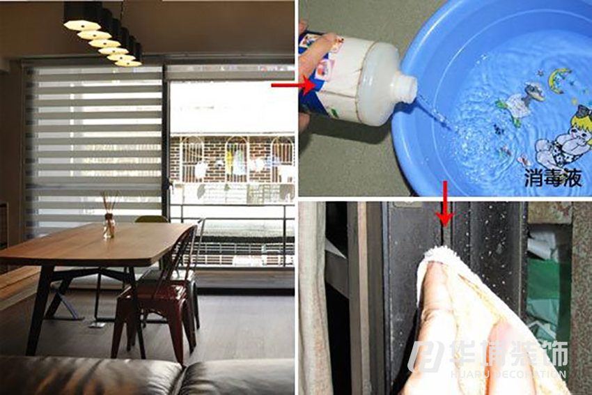 門窗清潔:門窗清潔時可以先用抹布將表面灰塵擦干凈,然后使用消毒液清潔窗戶軌道等縫隙位置。
