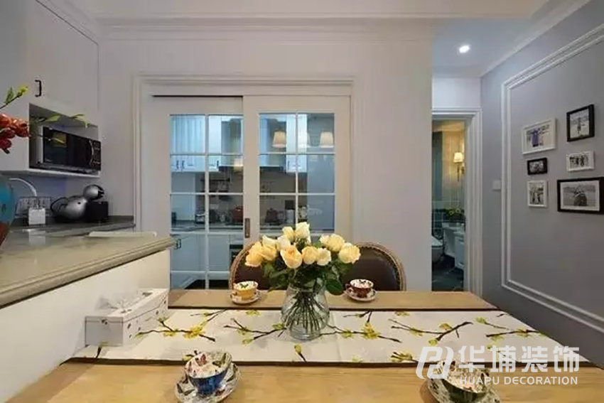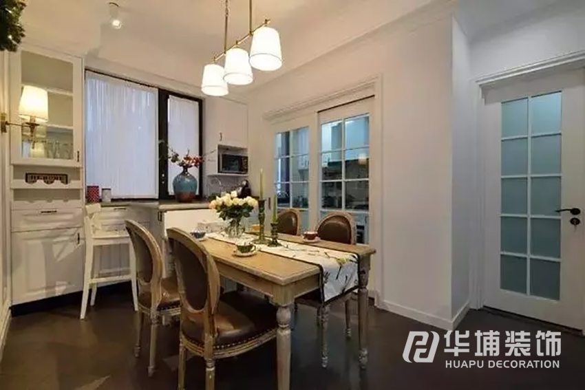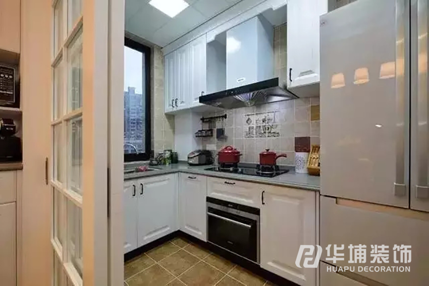 廚房延續(xù)了整個(gè)空間溫馨的氛圍,選用了白色的櫥柜和白色的廚房移門,地磚跟墻磚則采用了較花哨一點(diǎn)的花磚,穩(wěn)重中又不失俏皮。