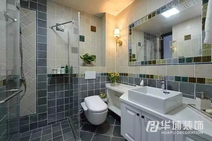 整個(gè)衛(wèi)生間盡顯空間,干凈整潔,收納有序。做舊的小塊拼花貼磚也是美式風(fēng)格中極為常見的。