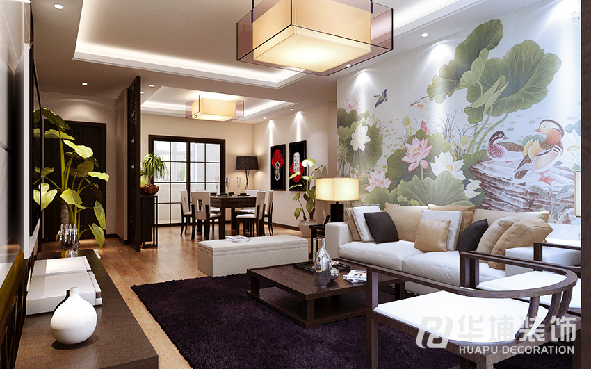 利用了后現(xiàn)代手法,墻上掛一幅中國山水畫,中式古樸的家居,使整個空間傳統(tǒng)中透著現(xiàn)代,現(xiàn)代中揉著古典。