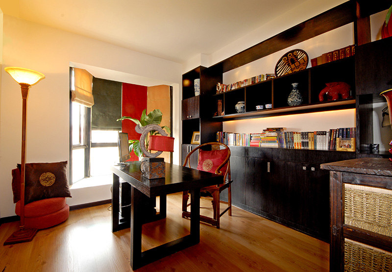 在書房設(shè)計(jì)凸顯混搭效果,家居的搭配充分體現(xiàn)了現(xiàn)代簡(jiǎn)約風(fēng)格的簡(jiǎn)潔、明快的特點(diǎn),以及中式的典雅韻味。