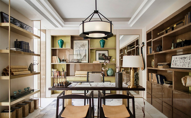 立式臺燈和吊燈與書房和整體空間的色彩非常統(tǒng)一。