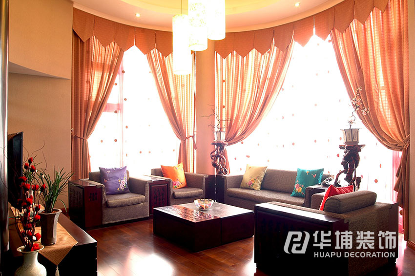 客廳吊頂以圓型造型為主,使空間更加飽滿(mǎn)通透。以黑胡桃木和中國(guó)紅作為整個(gè)空間的色彩點(diǎn)綴,米黃色為基調(diào)。配以博古架、窗花、根雕以及各式的盆景、中式掛件和特色靠墊,把整個(gè)的中式意境表達(dá)的淋漓盡致。
