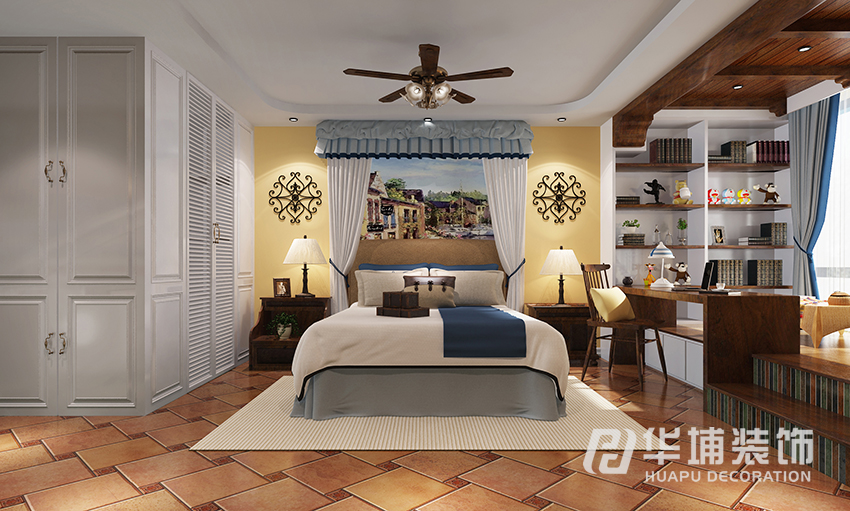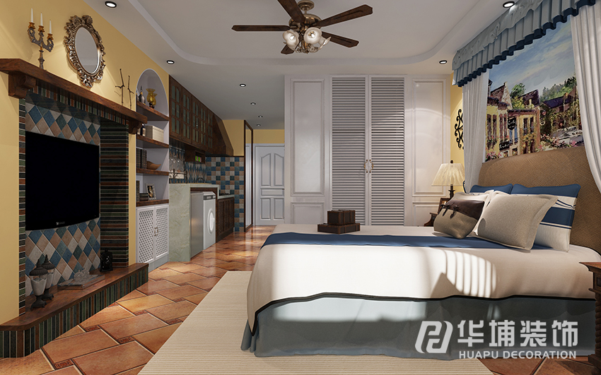 床頭背景墻運(yùn)用窗幔和壁畫相結(jié)合,打造出地中海的地域性特色。