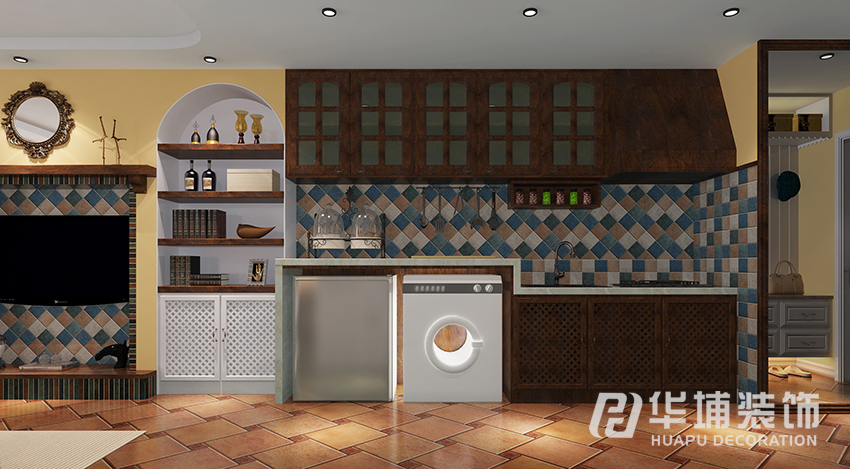 電視背景墻采用壁爐形式,再搭配小塊兒的仿古磚,兩邊設(shè)計(jì)兩個(gè)裝飾柜,造型別致,也非常實(shí)用。