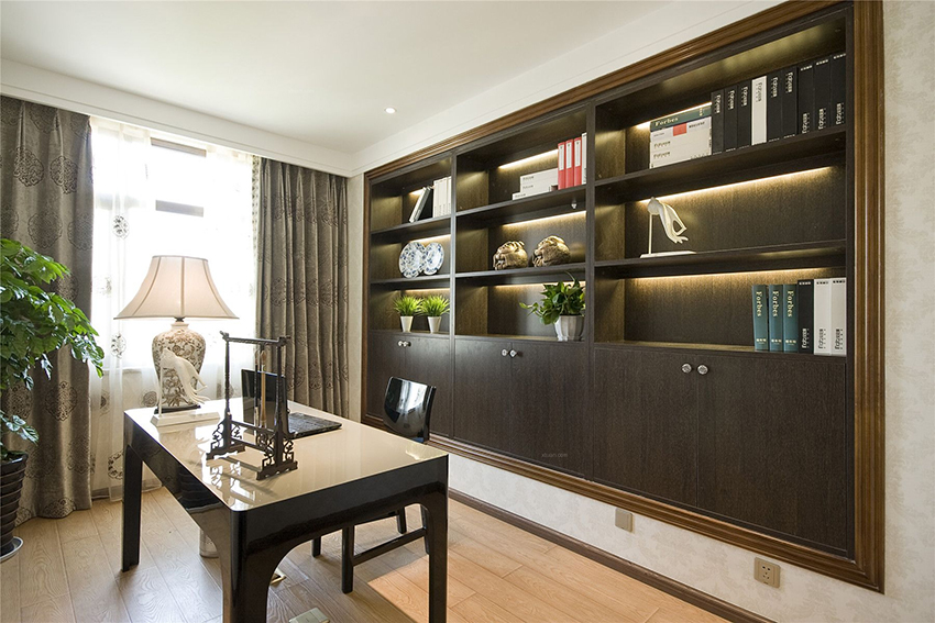 為了表現(xiàn)出書房中十足的書卷氣息,木質(zhì)家具無疑是最好的選擇,木質(zhì)書柜和桌椅擺成一套,書本帶著自然的氣息撲面而來,也將書房變成一個更加能給人帶來安靜平和心情的所在。