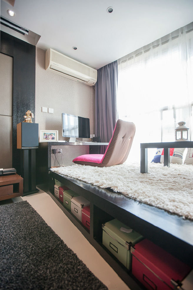 【三口之家 現(xiàn)代簡約三居室】客廳的榻榻米工作區(qū)很棒呢。伊頓上郡裝修設(shè)計效果。