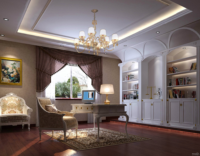 書房作為主人讀書寫字的場所,對(duì)于照明和采光的要求應(yīng)該很高,寫字臺(tái)最好放在陽光充足但不直射的窗邊。書房內(nèi)一定要設(shè)有臺(tái)燈和書柜用射燈,便于主人閱讀和查找書籍。