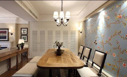 餐廳,餐桌,原木餐桌,漂亮的吊燈,碎花壁紙?zhí)貏e的好看